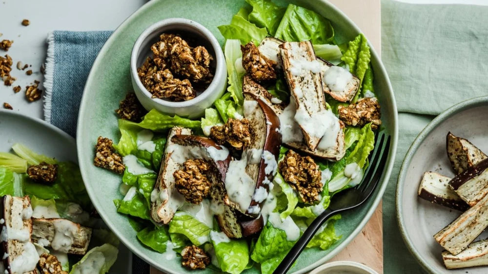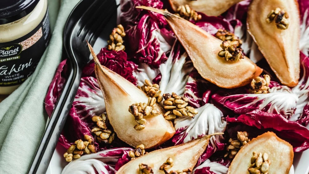 Gerösteter Birnen-Radicchio-Salat mit Tahini-Dressing und herzhaftem Müsli mit Sonnenblumenkernen