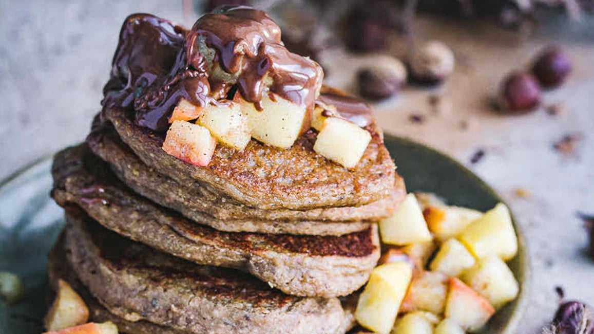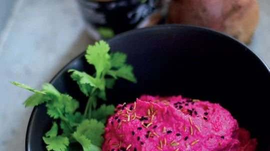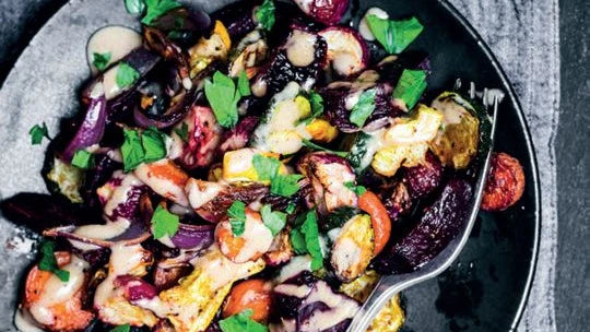 Kichererbsen-Kurkuma-Fusilli mit gerösteter Aubergine, Pflaumen, frischen Kräutern und Granatapfel