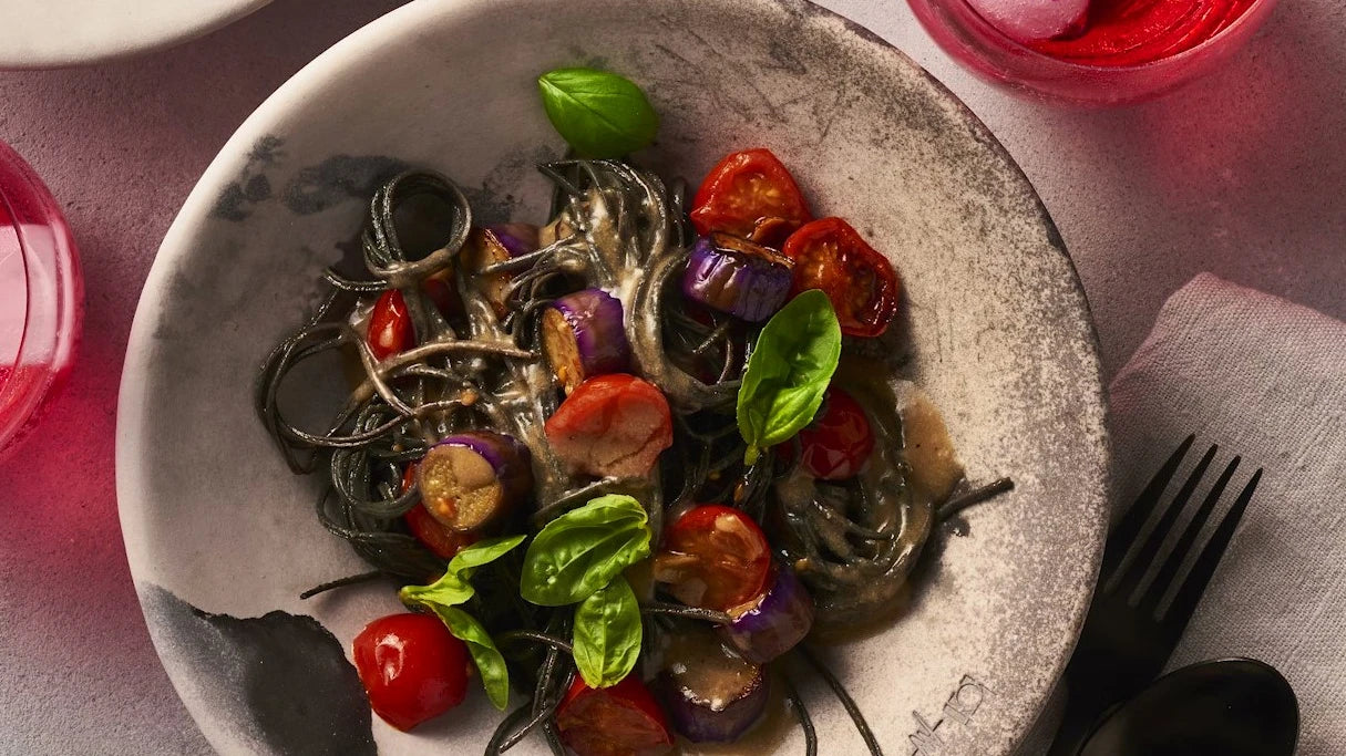 Schwarze Bohnen-Spaghetti mit sautierten Tomaten und Knoblauch