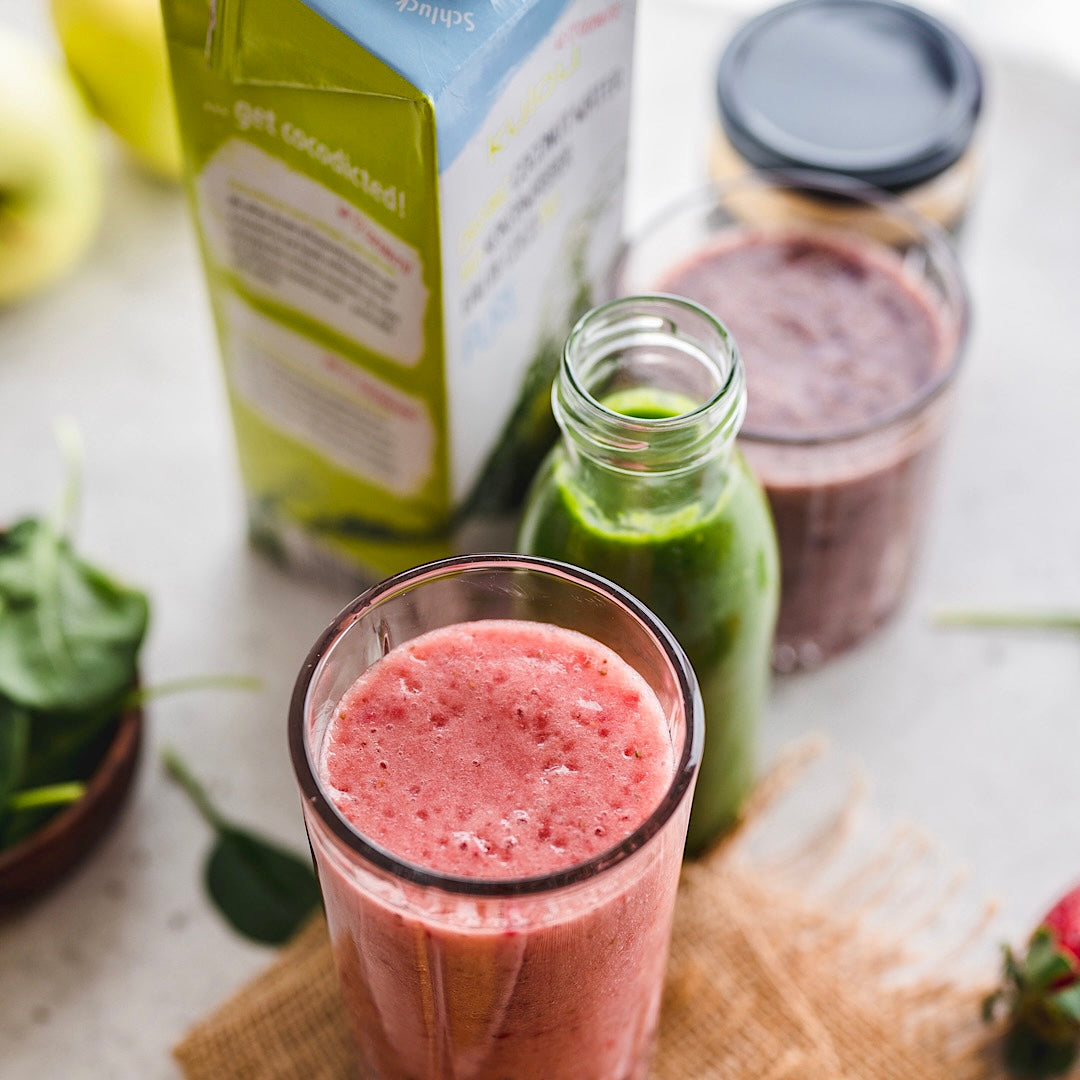 Geben Sie Kokosnusswasser mit Spinat, Banane, etwas Avocado und einem Spritzer Zitrone in Ihren Mixer, um einen erfrischenden Nährstoffschub zu erhalten. Für gesunde Fette und Cremigkeit fügen Sie einen Esslöffel Nussbutter hinzu.