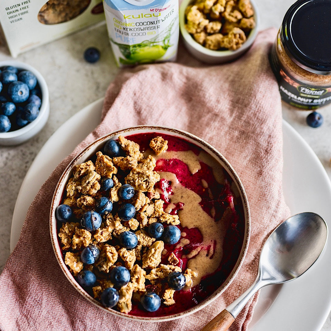 1 Banane, in Stücke geschnitten und gefroren, und ca. 150 ml Kokoswasser. Mit Kichererbsen-Granola und einem Spritzer Nussbutter garnieren.