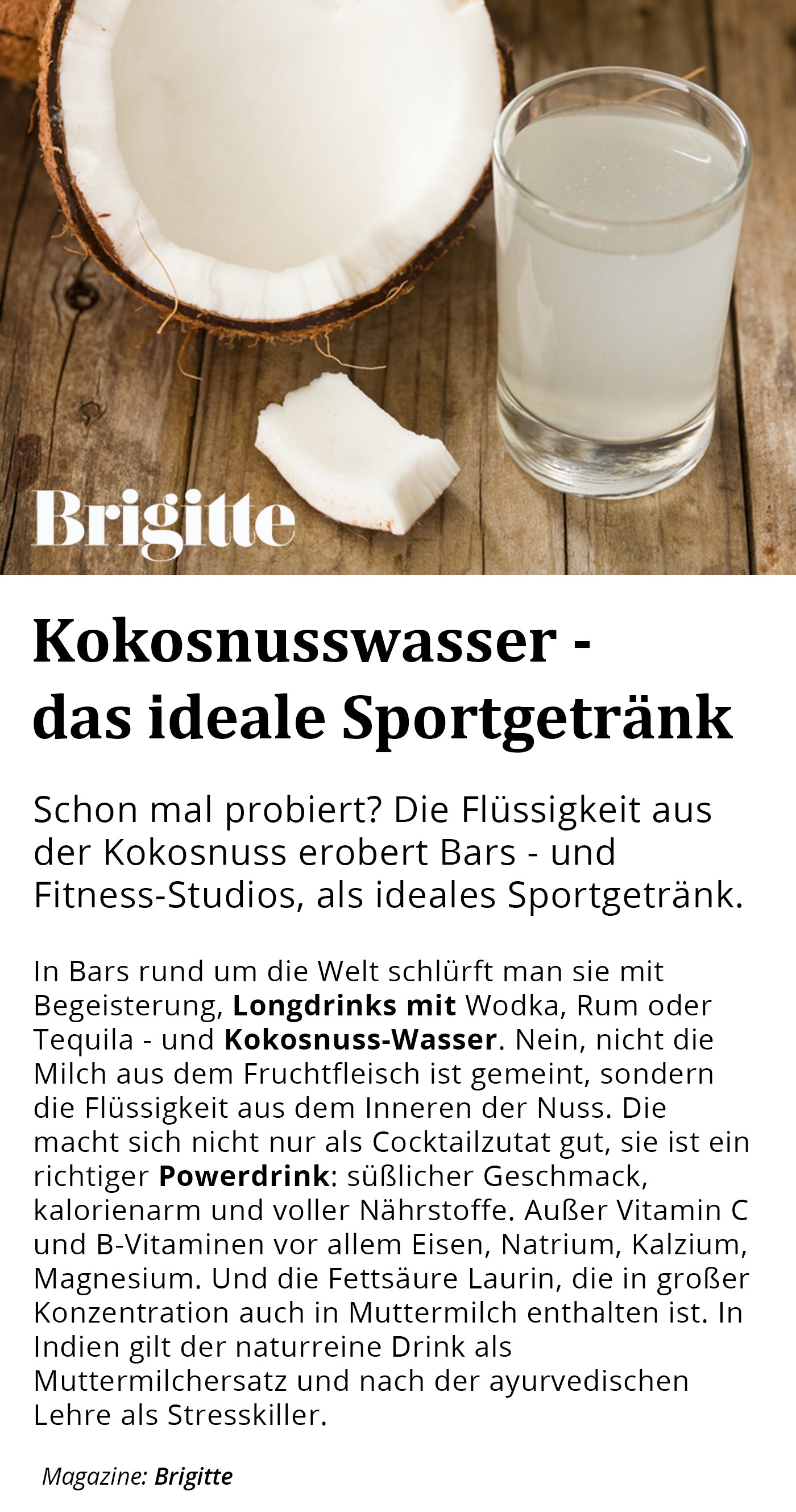 1. Er schmeckt pur und in Smoothies hervorragend. Er hat einen milden Geschmack nach frischer Kokosnuss.